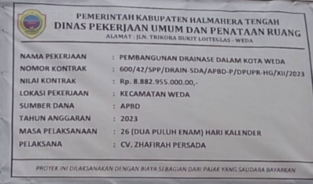 HAL-TENG, PERS TIPIKOR.ID – Proyek pembangunan drainase dalam Kota Weda, Kabupaten Halmahera Tengah, yang dibiayai melalui APBD Tahun Anggaran 2023, menyisakan tanda tanya besar. Dengan anggaran jumbo mencapai Rp9 miliar dan waktu pelaksanaan hanya 26 hari kalender, hasil akhir proyek justru menuai sorotan.