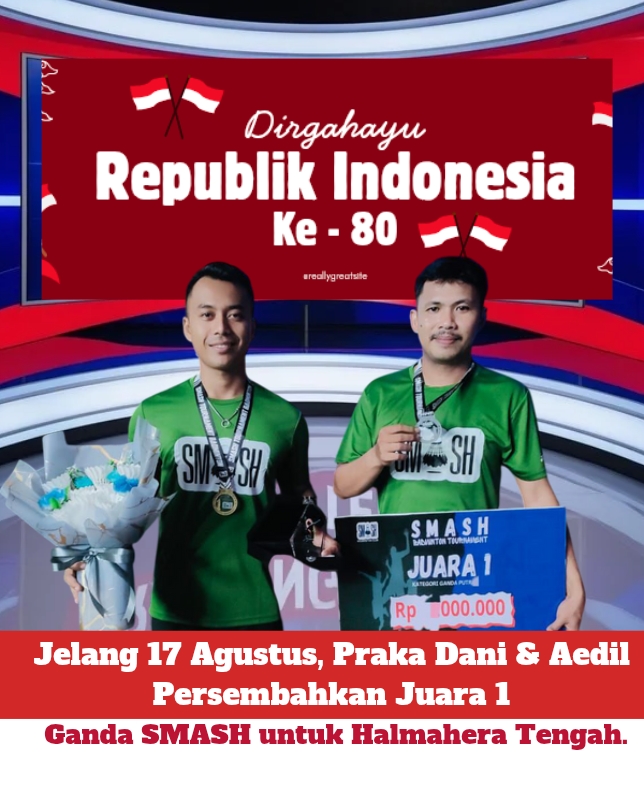 HAL-TENG, PERS TIPIKOR.ID – Menjelang peringatan Hari Kemerdekaan Republik Indonesia yang tinggal sekitar empat hari lagi, kabar membanggakan datang dari Kota Ternate. Pasangan ganda putra open, Praka Dani Syahri R — prajurit aktif Kodim 1512/Weda — bersama Aidil, atlet warga sipil yang bekerja di salah satu perusahaan, berhasil meraih juara 1 dalam turnamen bulu tangkis SMASH yang berlangsung sengit.