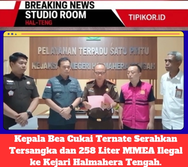 HAL-TENG, PERS TIPIKOR.ID – Kepala Kantor Bea Cukai Ternate, Jaka Riyadi, bersama timnya, Selasa (23/9/2025), menyerahkan tersangka beserta barang bukti terkait peredaran Minuman Mengandung Etil Alkohol (MMEA) ilegal ke Kejaksaan Negeri Halmahera Tengah.