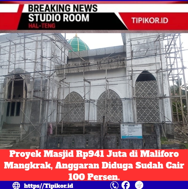 HAL-TENG, PERS TIPIKOR.ID — Dugaan penyimpangan kembali mencuat di Kabupaten Halmahera Tengah. Proyek rehabilitasi Masjid Nurul Yaqin di Desa Maliforo, Kecamatan Patani Utara, yang menelan anggaran Rp941 juta bersumber dari DAU 2024, hingga kini tidak kunjung rampung, padahal informasinya anggaran telah dicairkan 100 persen.