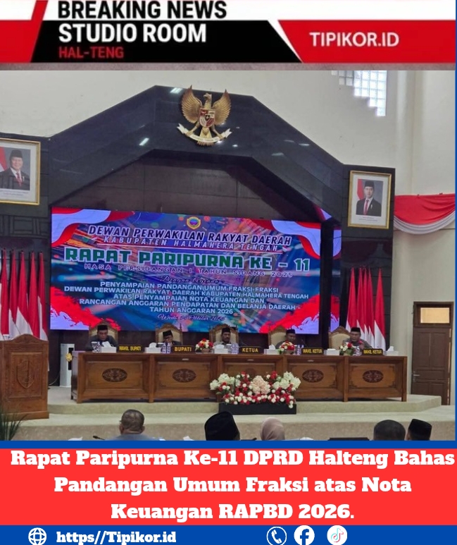 HAL-TENG, PERS TIPIKOR.ID — Dewan Perwakilan Rakyat Daerah (DPRD) Kabupaten Halmahera Tengah menggelar Rapat Paripurna Ke-11 Masa Persidangan I Tahun Sidang 2025, dengan agenda utama penyampaian pandangan umum fraksi-fraksi atas Nota Keuangan dan Rancangan Anggaran Pendapatan dan Belanja Daerah (RAPBD) Tahun Anggaran 2026.